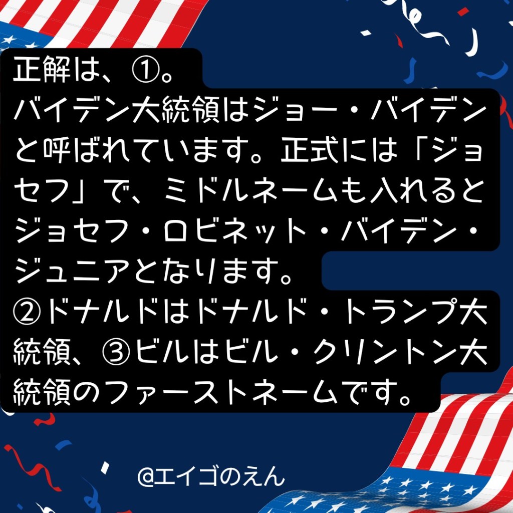 英語クイズ。 投稿者:Go Global2022年10月29日2022年10月30日カテゴリー:英語の豆知識 英語クイズです。バイデン大統領のファーストネームはなに? 共有: X で共有 (新しいウィンドウで開きます) X Facebook で共有 (新しいウィンドウで開きます) Facebook いいね 読み込み中… 関連
