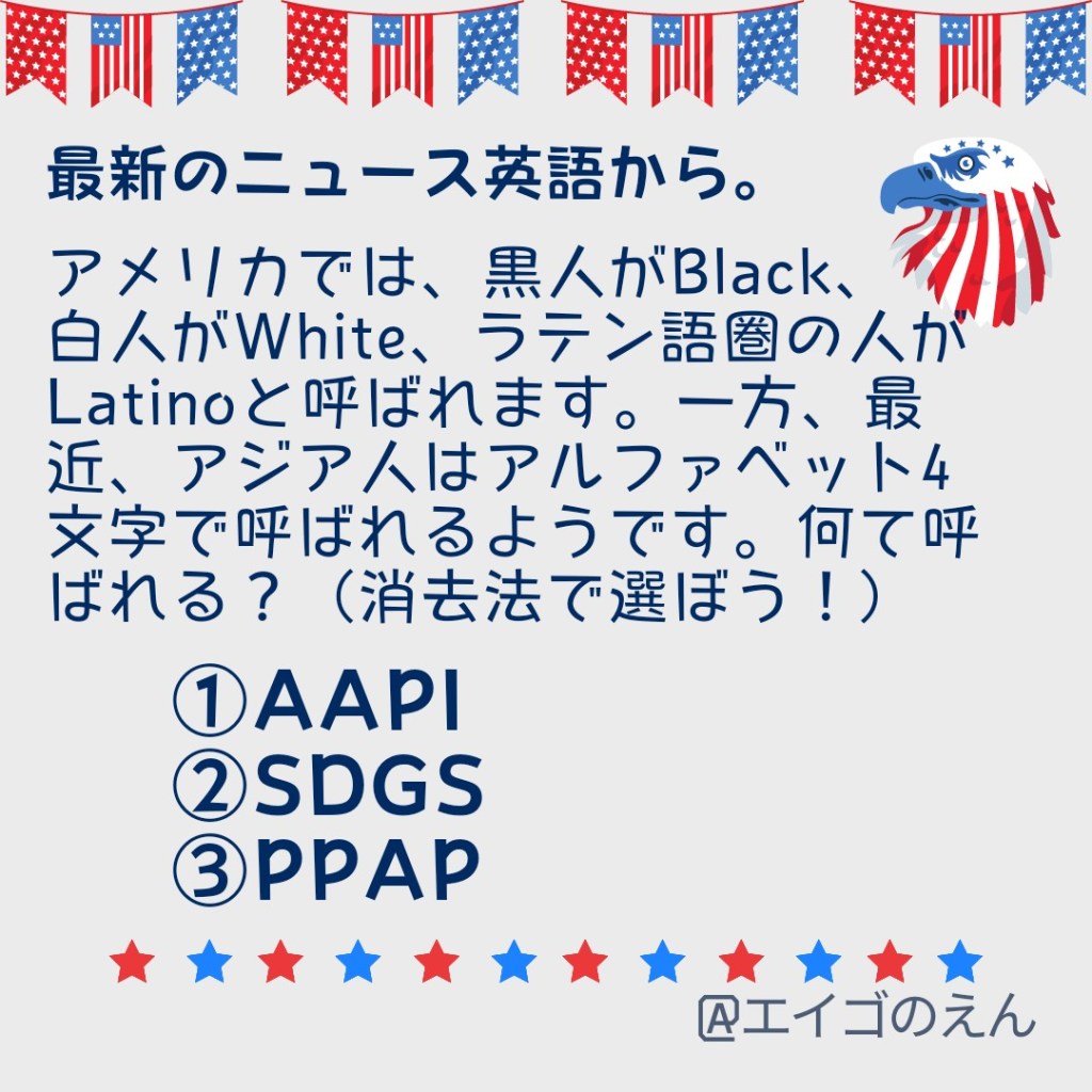 黒人はBlack、白人はWhite、ラテン系はLatino、アジア系は? 投稿者:Go Global2022年11月4日カテゴリー:英語の豆知識 最新のニュース英語から。アジア系アメリカ人は、何て呼ばれる? 共有: X で共有 (新しいウィンドウで開きます) X Facebook で共有 (新しいウィンドウで開きます) Facebook いいね 読み込み中… 関連
