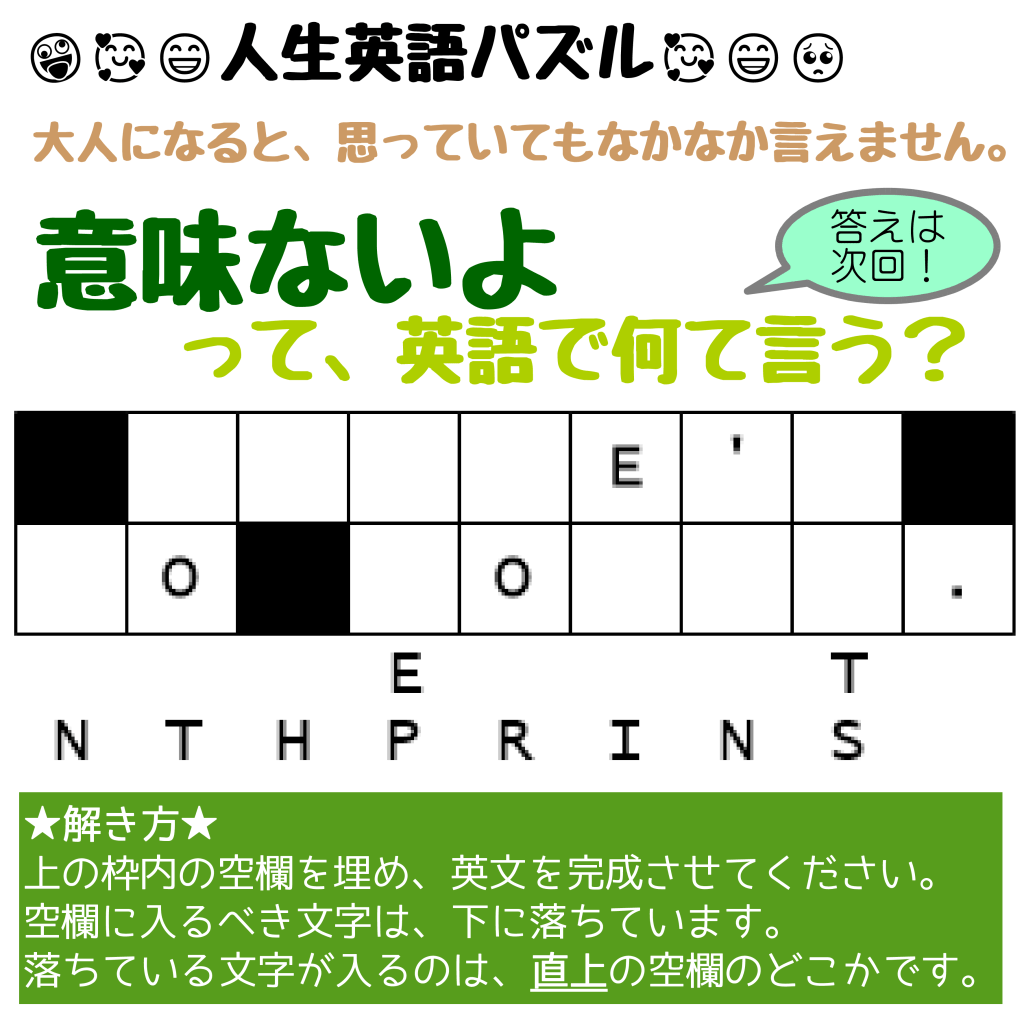 人生英語パズル。「意味ないよ」って、英語で何て言う? 投稿者:Go Global2022年12月9日カテゴリー:英語の豆知識タグ:オンライン英会話、オーストラリア、ネイティブ、ラジオ英会話、稲毛海岸、英語スピーチ、英検、英会話、多聴多読、海浜幕張 Goグローバルの鳥居です。 前回のパズルは「そういう巡り合わせ」って英語で何て言う?でした。答えは… “It’s meat to be.” です。 今日のパズルはこちら。「意味ないよ」って英語で何て言う? 共有: X で共有 (新しいウィンドウで開きます) X Facebook で共有 (新しいウィンドウで開きます) Facebook いいね 読み込み中… 関連