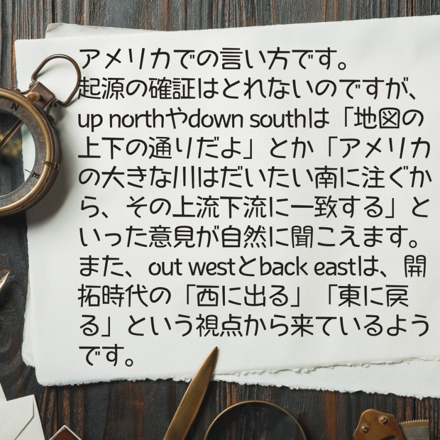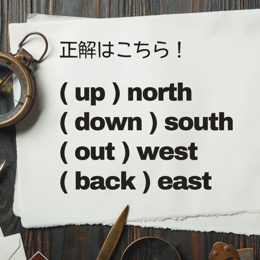 「南へ」は、down south。でも、北と東と西は何て言う? 投稿者:Go Global2023年6月10日カテゴリー:英語の豆知識タグ:オンライン英会話、オーストラリア、ネイティブ、ラジオ英会話、稲毛海岸、英語、英語スピーチ、英検、英会話、千葉、多聴多読、海浜幕張 Goグローバルの鳥居です。皆さんは、答えが分かりますか? 共有: X で共有 (新しいウィンドウで開きます) X Facebook で共有 (新しいウィンドウで開きます) Facebook いいね 読み込み中… 関連