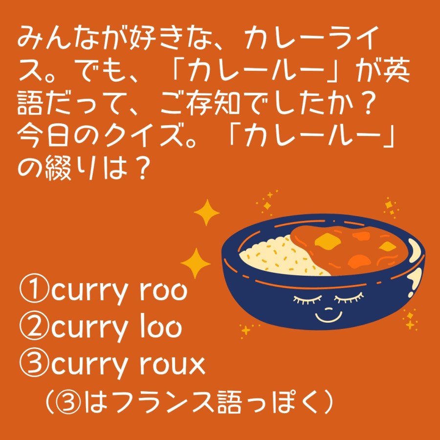 「カレールー」は、何と、英語。でも、どう書く? 投稿者:Go Global2023年6月18日カテゴリー:英語の豆知識タグ:オンライン英会話、オーストラリア、ネイティブ、ラジオ英会話、稲毛海岸、英語、英語スピーチ、英検、英会話、千葉、多聴多読、海浜幕張 Goグローバルの鳥居です。英語クイズ! 共有: X で共有 (新しいウィンドウで開きます) X Facebook で共有 (新しいウィンドウで開きます) Facebook いいね 読み込み中… 関連