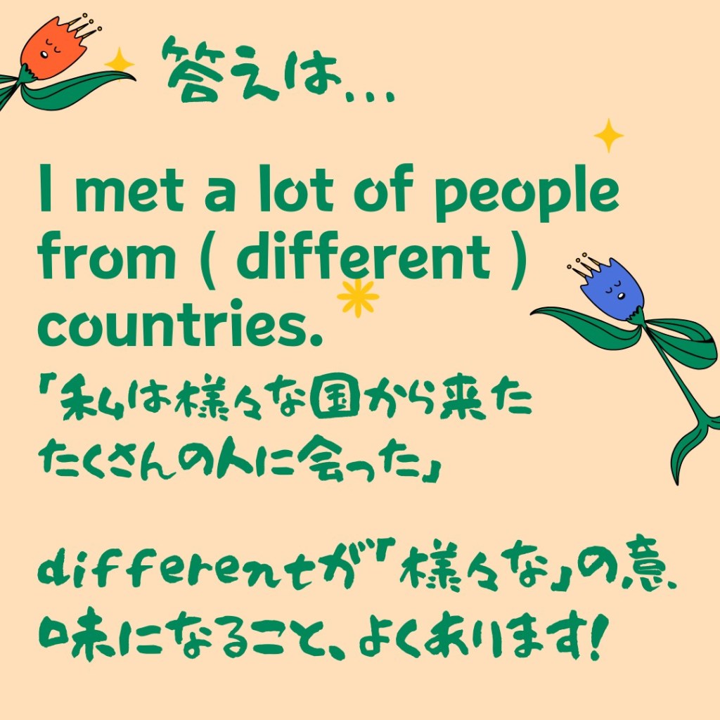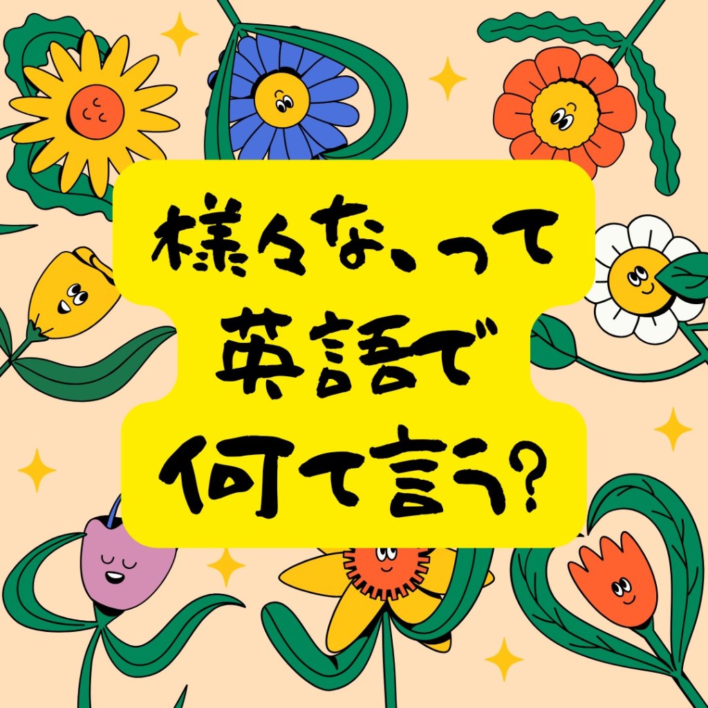 「様々な」って、英語で何て言う? 投稿者:Go Global2023年7月9日カテゴリー:英語の豆知識タグ:オンライン英会話、オーストラリア、ネイティブ、ラジオ英会話、稲毛海岸、英語、英語スピーチ、英検、英会話、千葉、多聴多読、海浜幕張 Goグローバルの鳥居です。「様々な」「いろいろな」。とても便利な表現ですね!でも、英語で何て言う? 共有: X で共有 (新しいウィンドウで開きます) X Facebook で共有 (新しいウィンドウで開きます) Facebook いいね 読み込み中… 関連